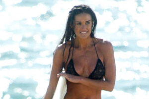 In the midst of preparing to be a first-time grandma, Demi Moore wowed in a panther print two-piece while investing energy with her shaggy companion on Apr. 20...