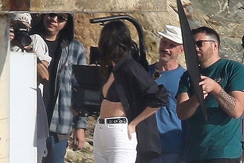 Kendall Jenner Rocks Dark Two-Piece Top & White Shorts For Ocean Side Photoshoot