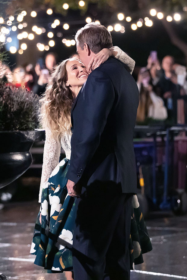 SJP looked beautiful for the new scenes in a blue botanical dress. She kept warm with a ribbon sweater over the top. Chris shook Big’s unmistakable suit.